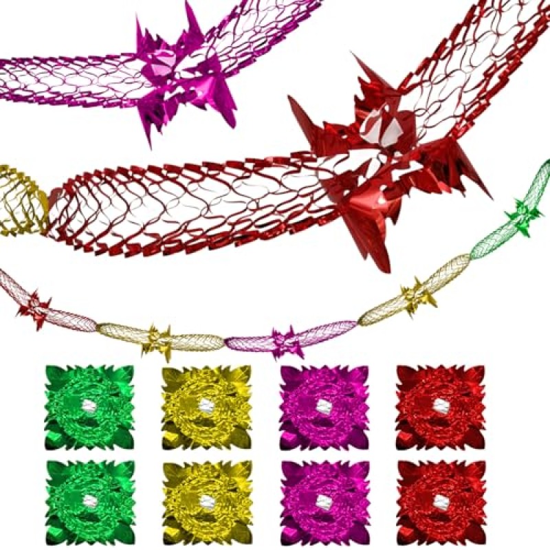 - 8-piece set featuring vibrant red, green, gold, and purple garlands