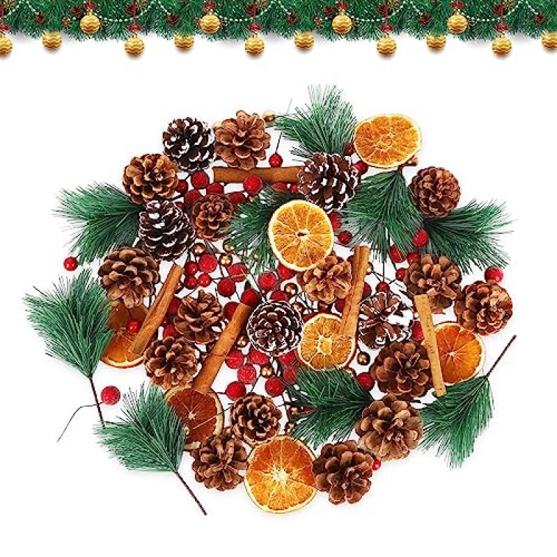 - Includes 20 pine cones, 10 dried orange slices, 5 cinnamon sticks, 10 artificial pine branches, and 150 artificial berries to craft a full, festive wreath.