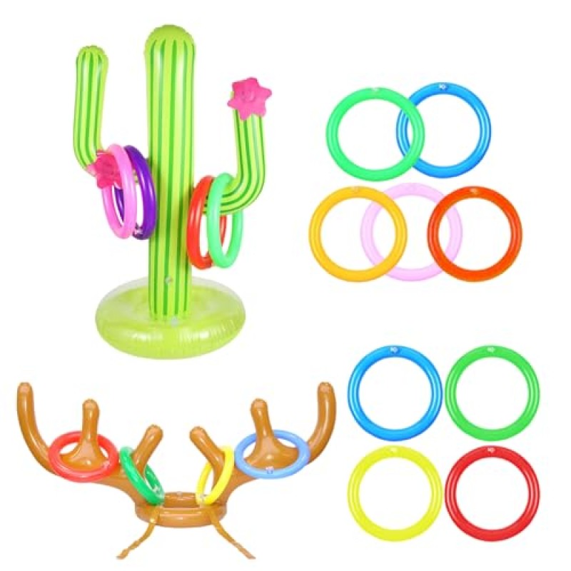 - Includes 11 pieces: inflatable reindeer antler hat, cactus ring toss game, and 9 inflatable rings for group play.