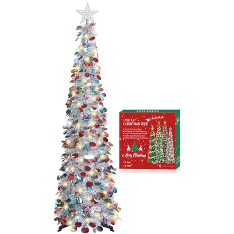 HMASYO 5FT Pop Up Tinsel Christmas Tree with Timer Lights
