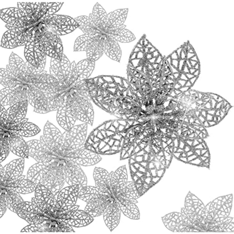 - Set includes 30 silver glitter poinsettias in three sizes: 10 of each 7.5cm, 10cm, and 15cm diameters.