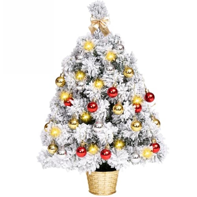 LED-Lit Snow Flocked Mini Tabletop Christmas Tree with Ball Ornaments