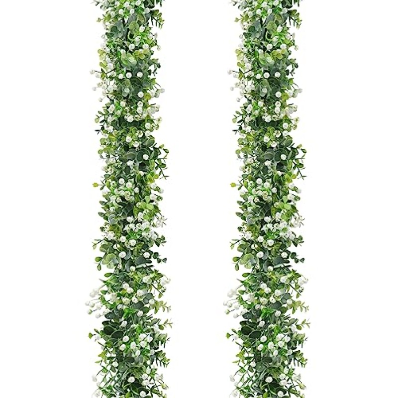 - Includes 2 garlands, each approximately 6 feet long, adorned with eucalyptus leaves and white flowers.