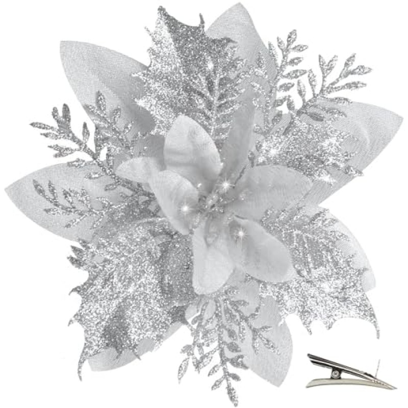 MIKAILE Silver Glitter Artificial Poinsettia Flowers with Clip