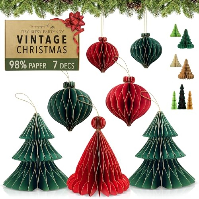 Made from sturdy card rather than fragile tissue paper, these premium decorations are built to last through many festive seasons, offering an eco-friendly alternative to single-use plastic decor. The set includes charming Christmas trees, a Santa hat, and red and green baubles in various sizes, allowing you to craft a warm, inviting ambience that celebrates the nostalgia of Christmas past while embracing sustainable living. Stored neatly in a reusable box, these decorations invite you to create lasting memories year after year in an environmentally kind way.