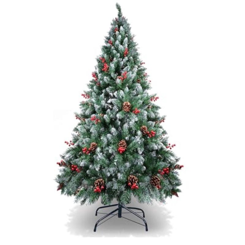 Snow Flocked Artificial Christmas Tree with Pine Cones and Red Berries