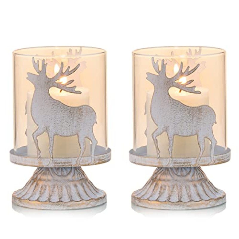 - Set includes two metal pillar candle holders with charming deer motifs, perfect for festive displays.