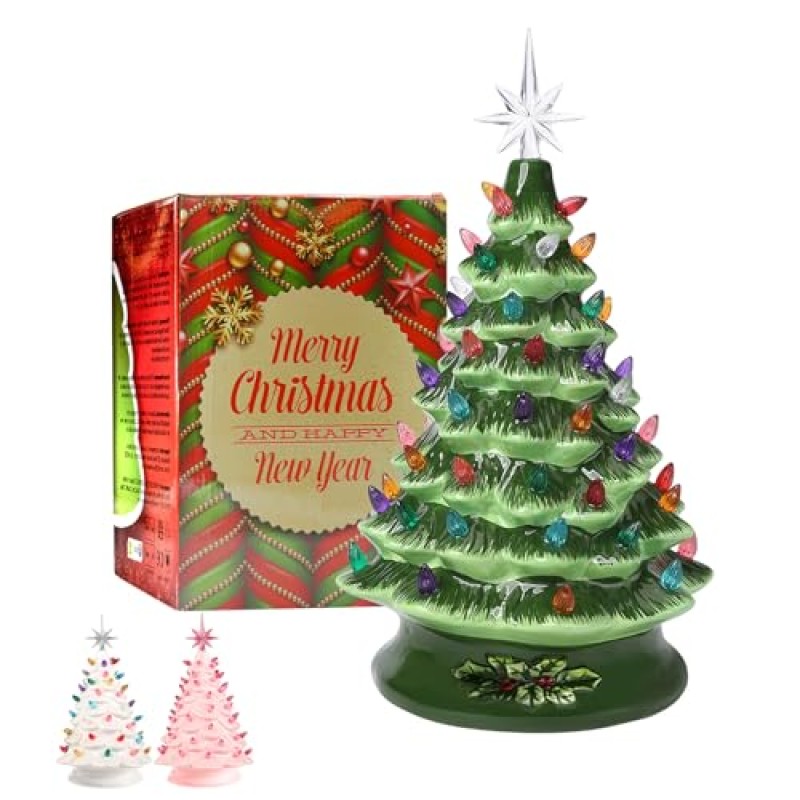 - π Green Ceramic Christmas Tree standing at 13 inches tall, including a Star Topper, to add a touch of nostalgia to your festive decor.