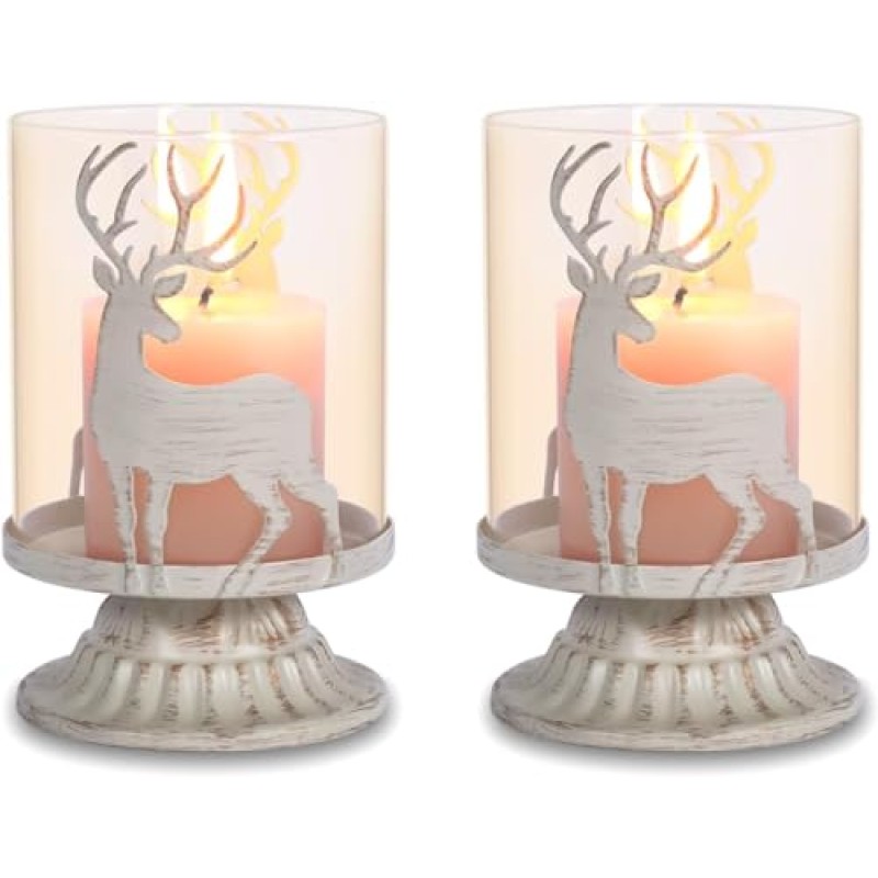 - Set includes two metal pillar candle holders with vintage reindeer design in antique white finish.